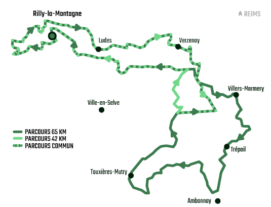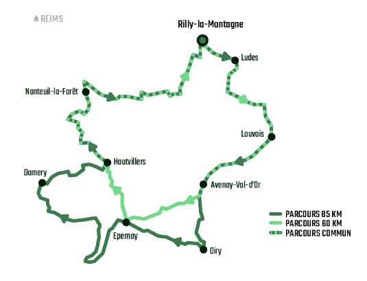 Après un temps d’échauffement dans les galipes, premier épisode du « tout à gauche » pour monter dans « la montagne » et la forêt par une portion routière puis vous gagnerez le Val-de-Livre après Ville-en-Selve. Vous suivrez la Livre jusque Avenay-Val-d’Or avant de remonter à travers les vignobles jusqu’au promontoire Notre-Dame du Gruget de Mareuil-sur-Ay. De loin vous apercevrez le mont Bernon, la prochaine difficulté, qui veille sur Épernay. Après l’avoir vaincu, vous dévalerez vers la magnifique avenue de Champagne et ses maisons de champagne réputées, classée au Patrimoine mondial de l’Unesco. Un tracé urbain vous emmènera au pied de coteaux abruptes qu’il faudra gravir jusqu’au chemin de Ceinture. Là encore le point de vue ne vous décevra pas. Vous franchirez la Marne à Damery, puis remonterez des chemins bétonnés et des chemins de vignes en lisière de forêt. A Hautvillers, dont la star locale est Dom Pérignon, vous vous rincerez l'œil avec le splendide panorama sur Cumières et la Marne, site classé par l’Unesco, devant le buffet du deuxième ravito.